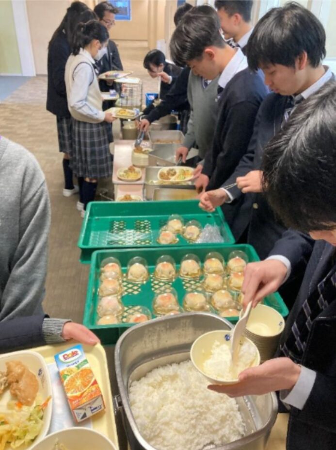 関西大学中等部(大阪府高槻市)の給食は、季節感のあるバランスの取れたメニューが特長だ。なかでもスイーツ系のレベルが高く、七夕ゼリーや月見大福、クリスマスケーキなども登場する。過去には、地元の有名洋菓子店のパティシエが「Xmasパルフェ」を特別に作ってくれたこともある。生徒から「デパ地下から仕入れたみたい♪」とクオリティーの高さに歓声が上がったという。