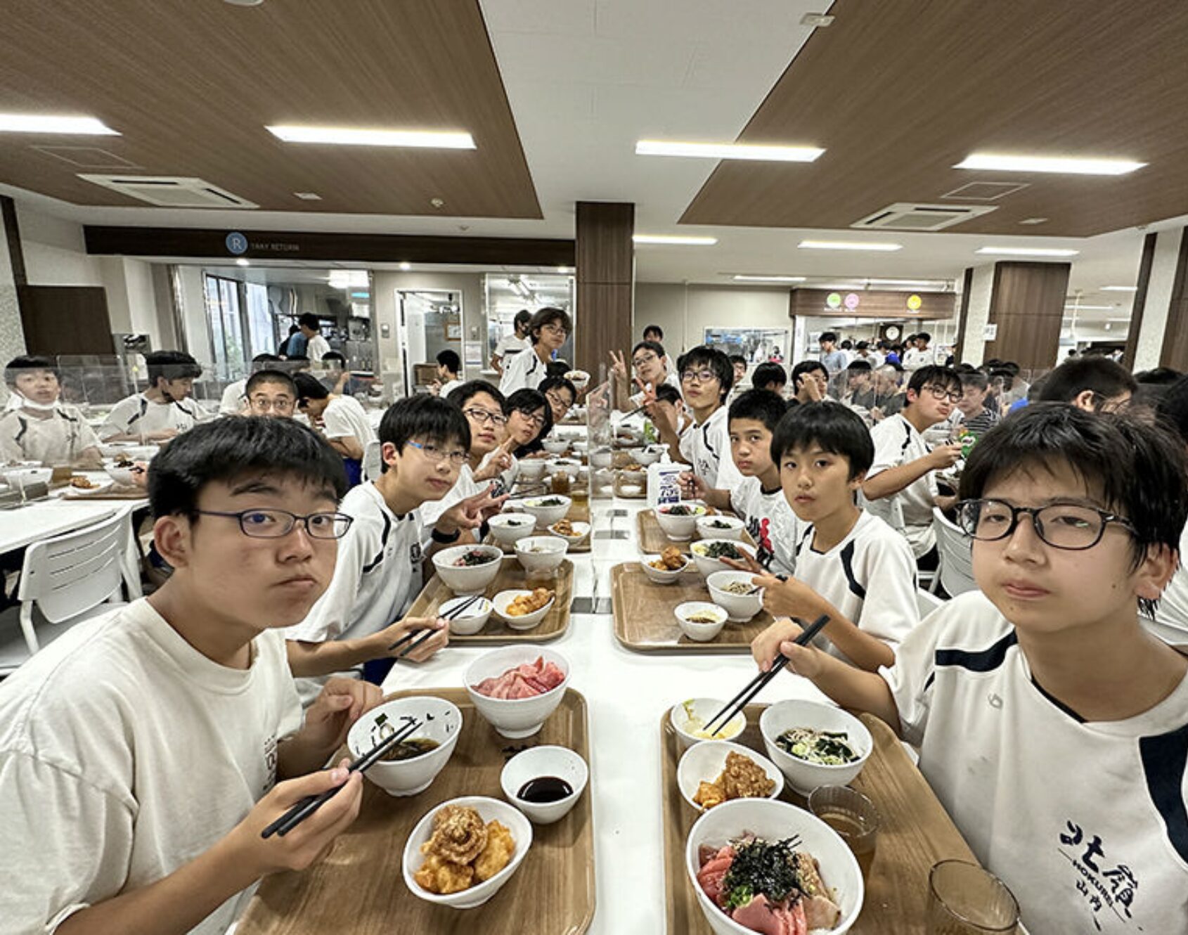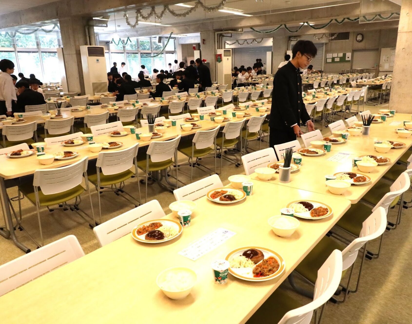 昼休み。4時間目が終わるチャイムとともに生徒たちが食堂に向かう。昼食時は座席が指定され、配膳が完了している。朝食、夕食や休日の昼食は自由席で、部活動生同士や友人同士で楽しく語らいながら食べる。